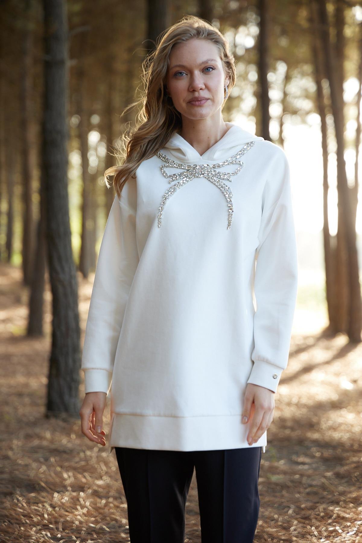 Fiyonk Taşlı Kapşonlu Sweatshirt - Ekru