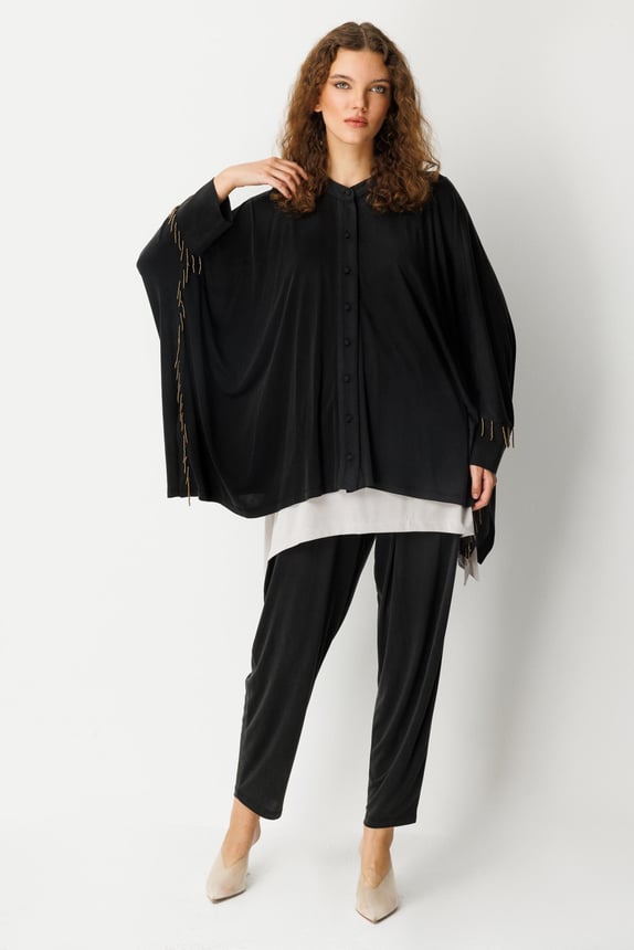 Pantolon beli lastikli, yarasa kol, boncuk işlemeli, düğme kapamalı alt üst takım-