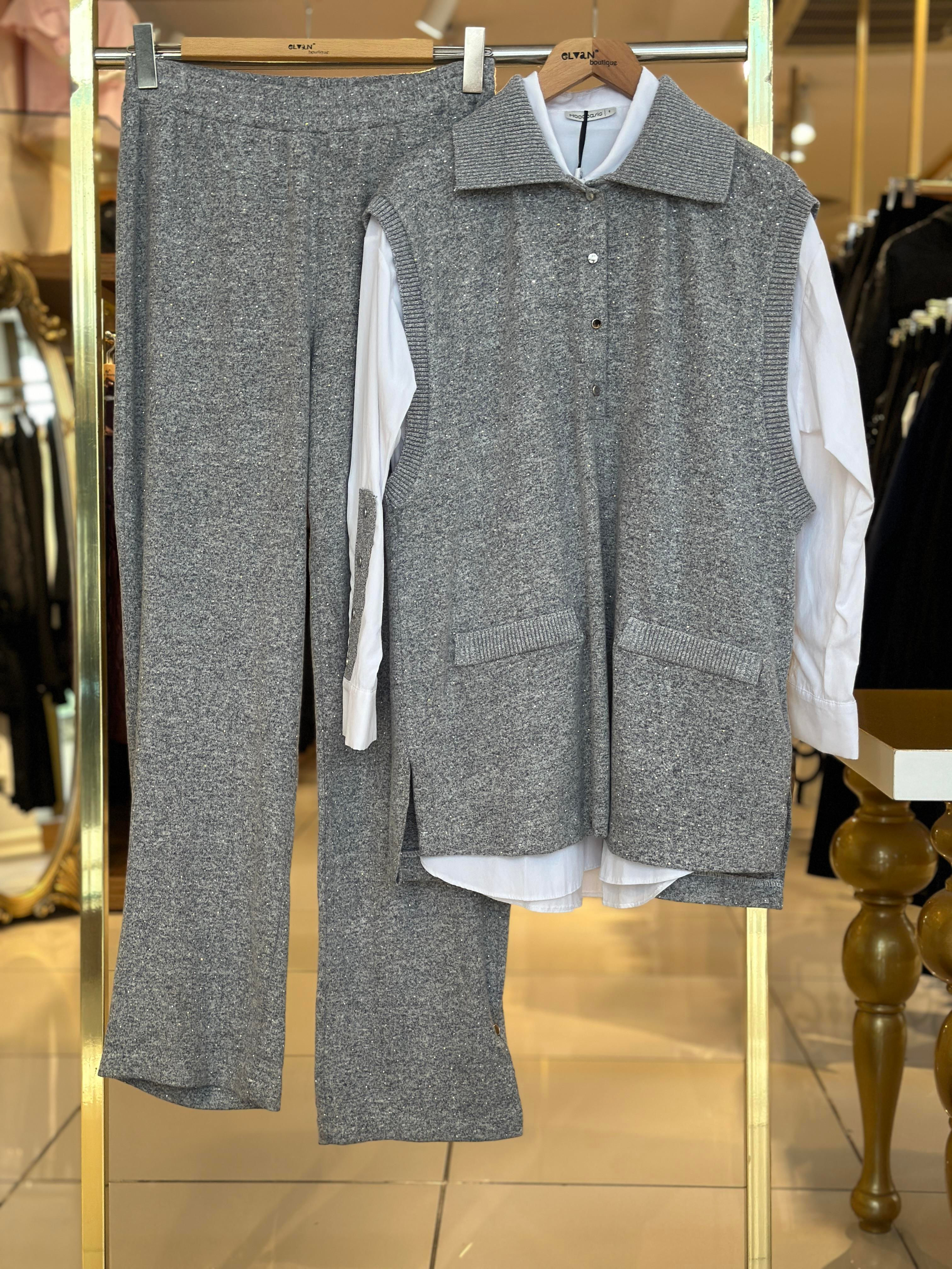 Serpme Taşlı Süveterli Üçlü Takım - Gri