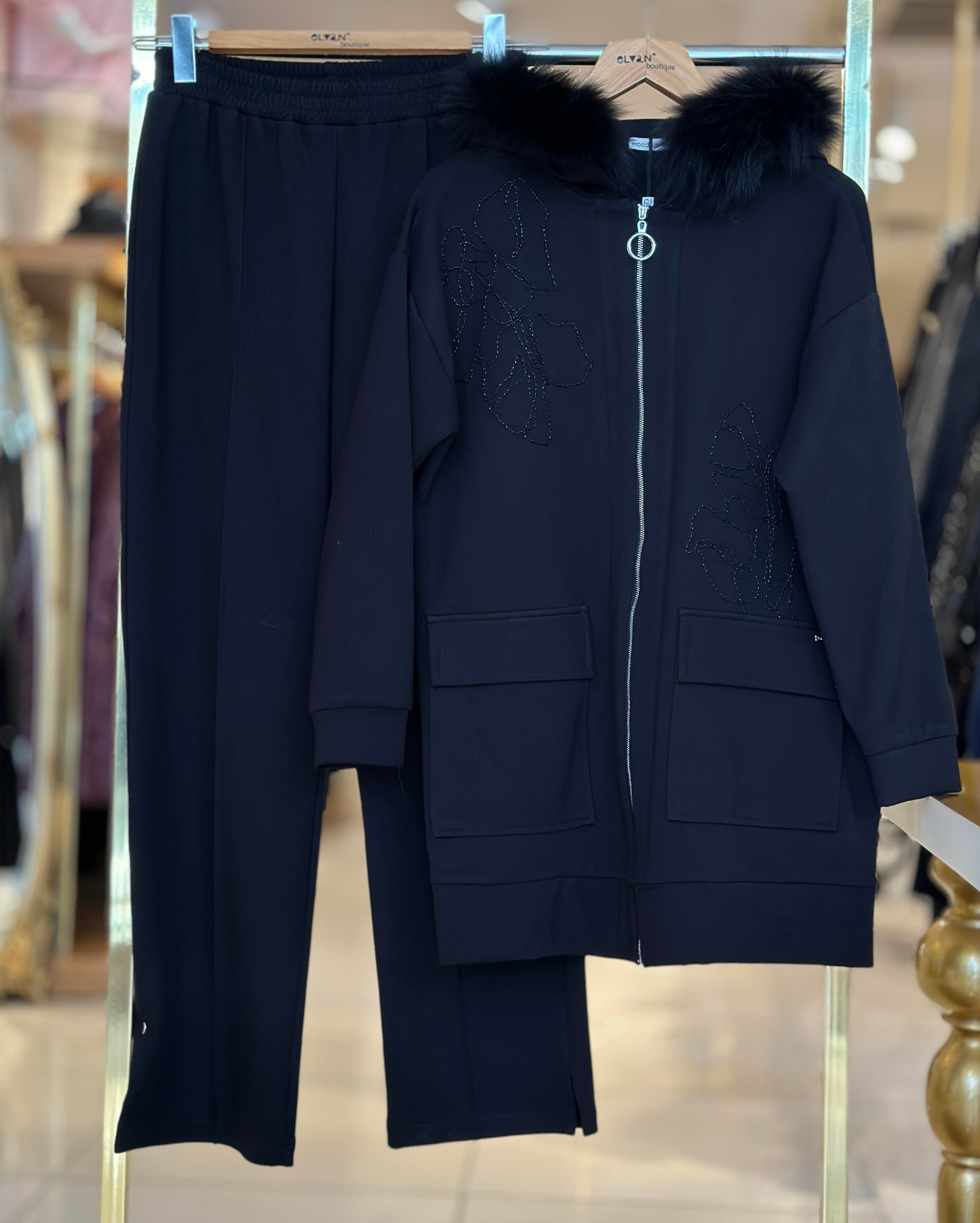 Boncuk Nakışlı Kapşonlu Kürklü Takım - Siyah