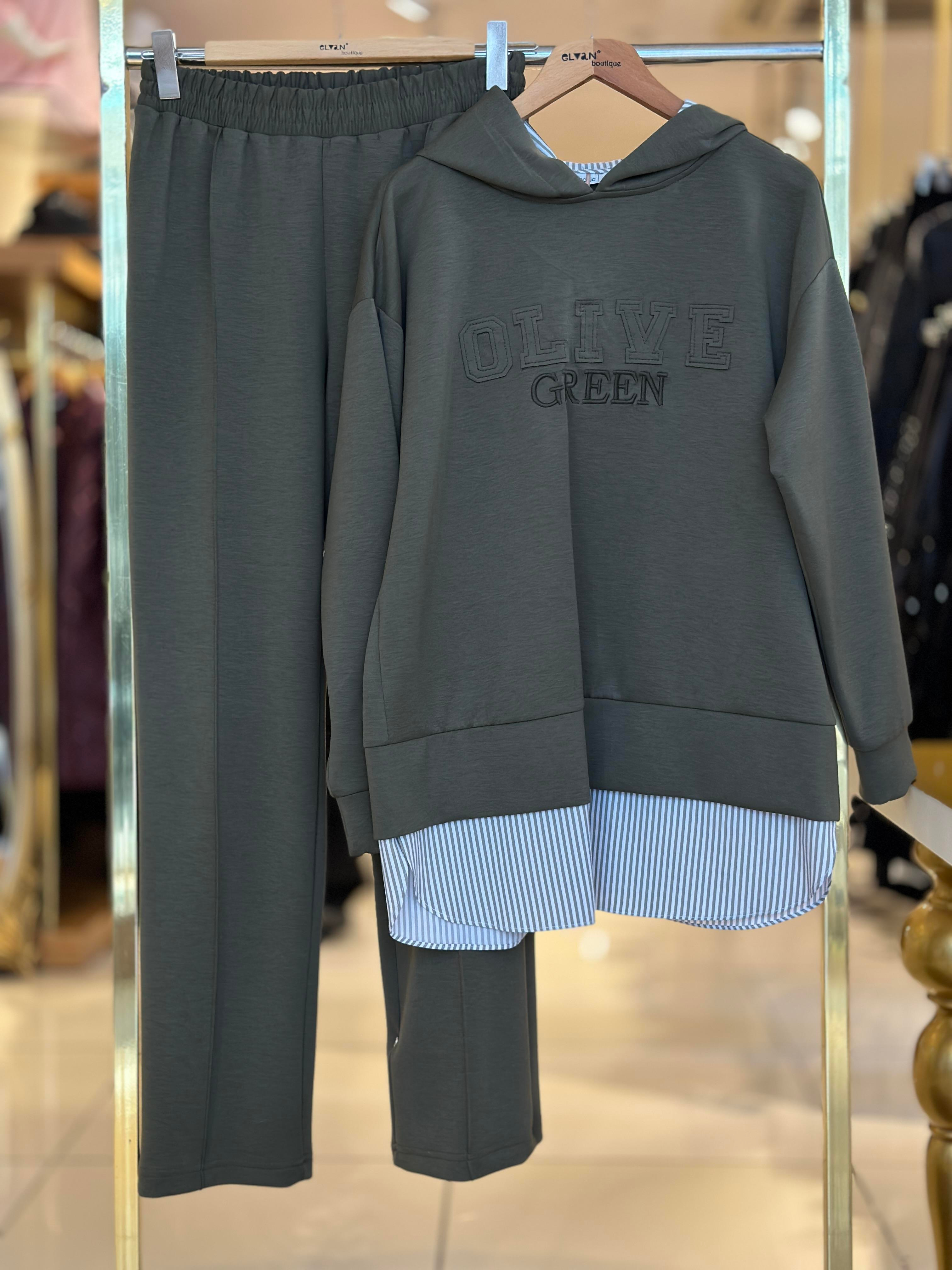 Aplike Nakışlı Kapüşonlu Oyso Takım - Haki
