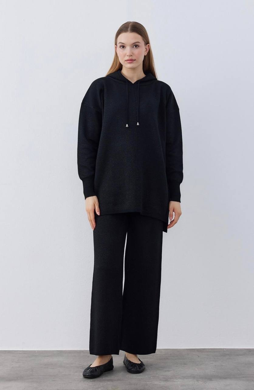 Kapşonlu Simli Triko Pantolon Takım - Siyah
